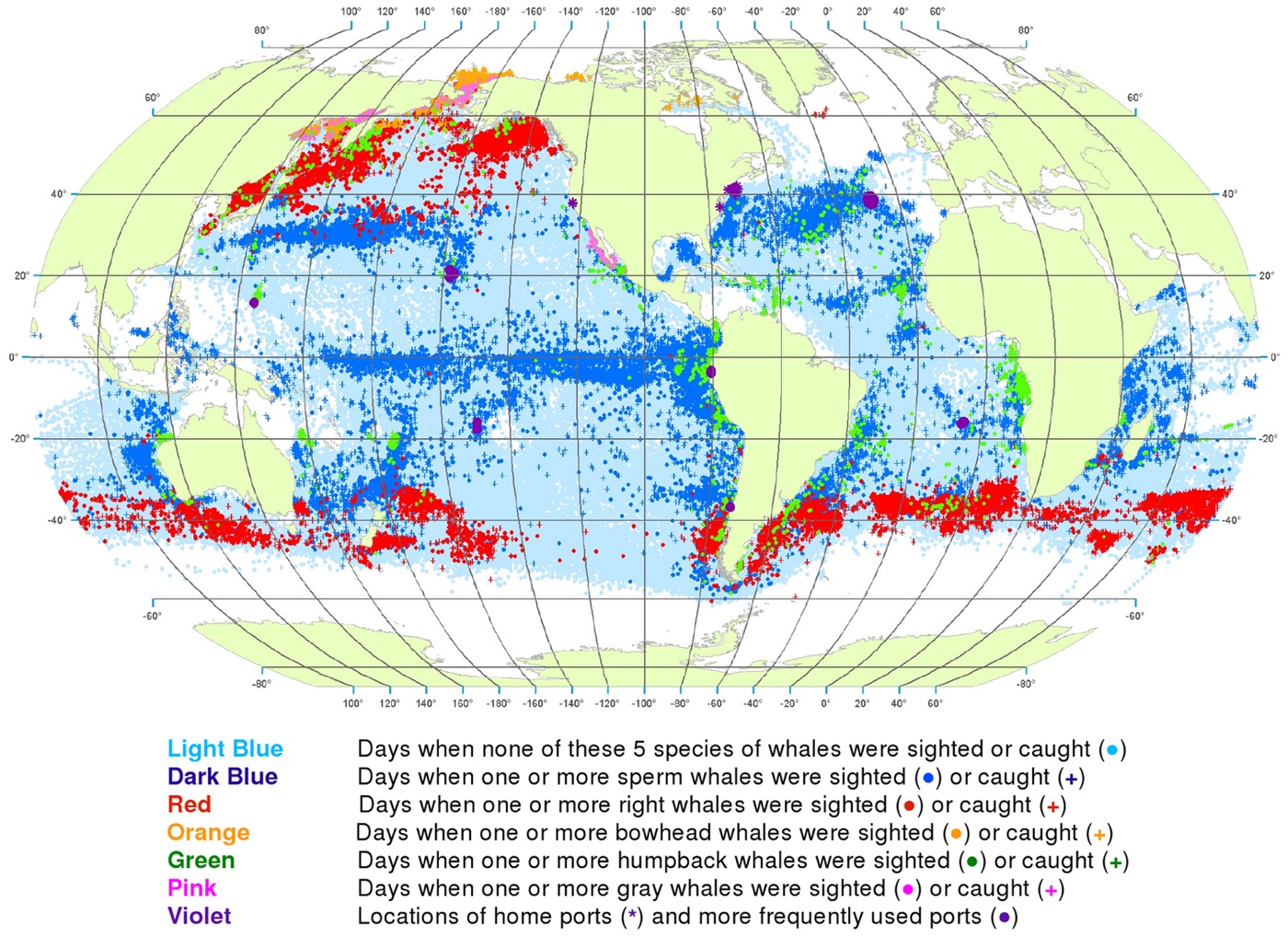 Extensive records of American whaling in the form of daily entries in whaling voyage logbooks and contain a great deal of information about where and when the whalemen found whales. The second part of the database’s foundation is the American Offshore Whaling Log database, which includes information from 1,381 logbooks from American offshore whaling voyages between 1784 and 1920. These data were extracted from the original whaling logbooks during three separate scientific research projects, one conducted by Lieutenant Commander Matthew Fontaine Maury in the 1850s, the second conducted by Charles Haskins Townsend in the 1930s, and the third conducted by a team from the Census of Marine Life project led by Tim Denis Smith between 2000 and 2010. The data file includes 466,134 data records assembled in a common format suitable for spatial and temporal analysis of American whaling throughout the 19th century.