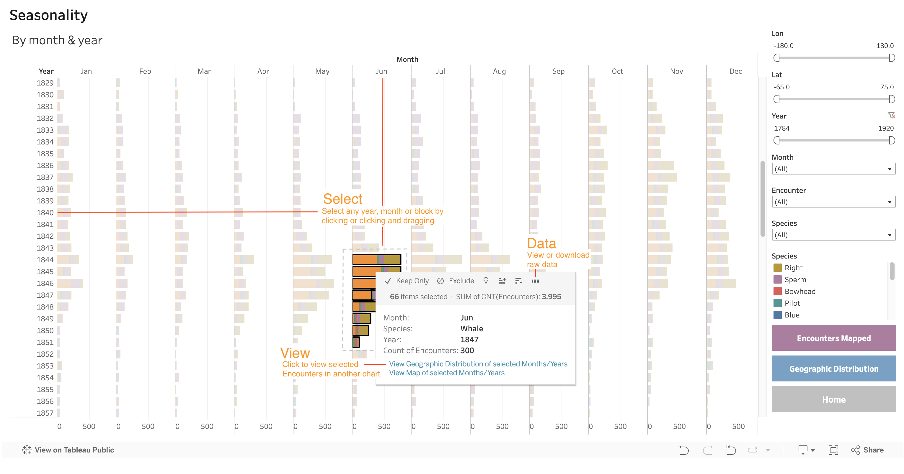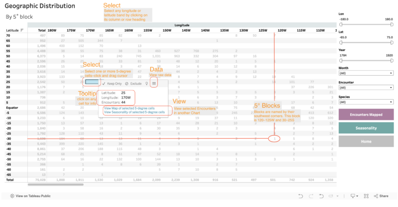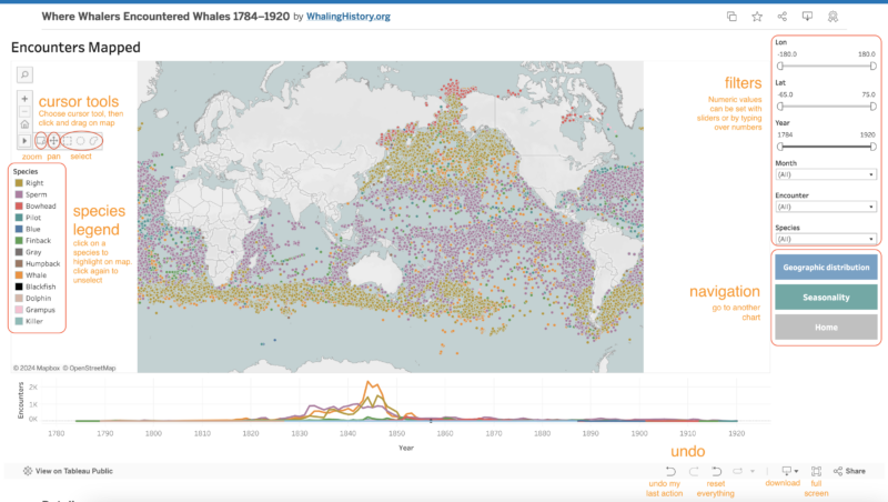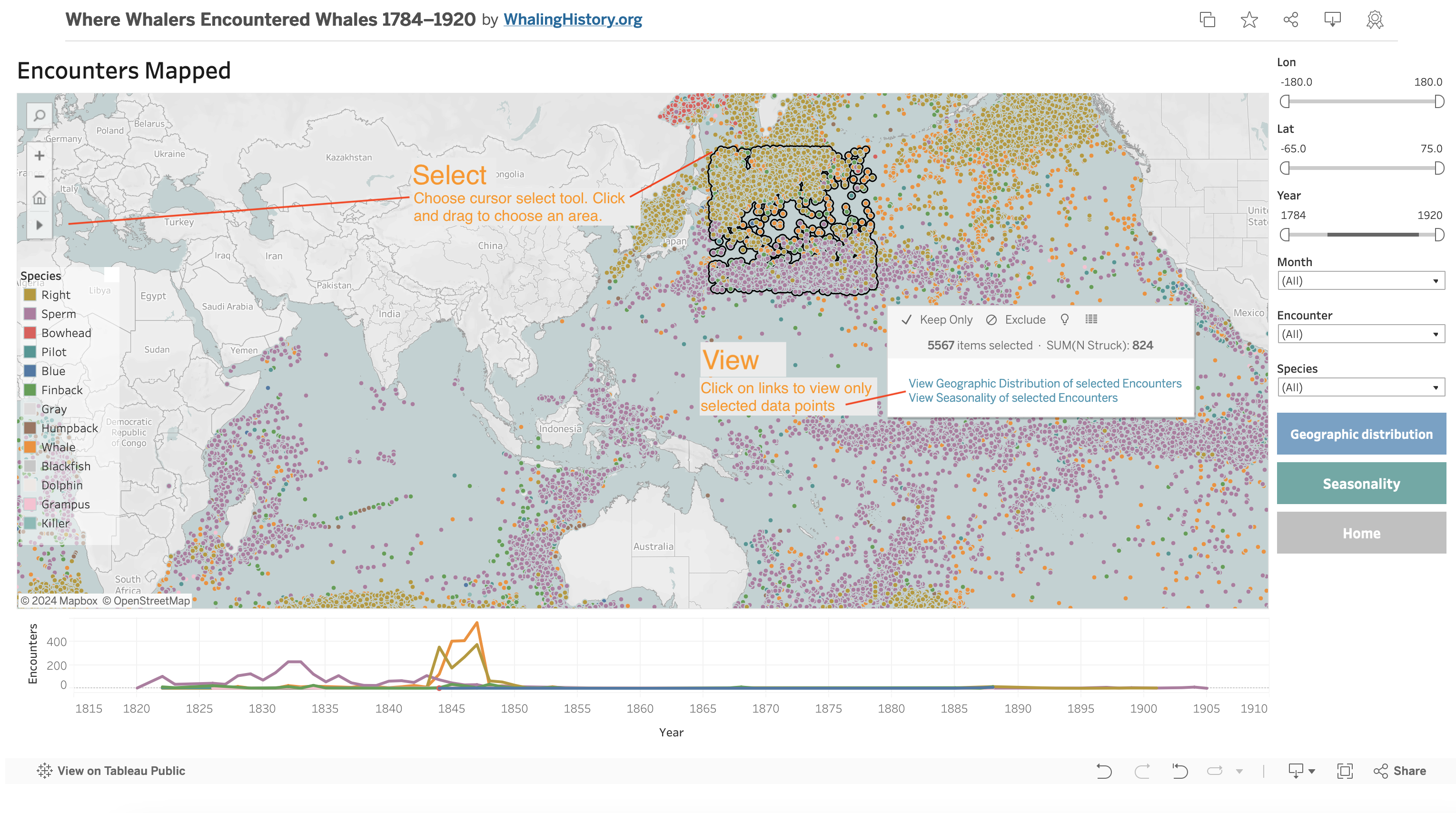 The American Offshore Whaling Logbook database, contains records transcribed from whaling log books giving information on the whales seen and captured. This database consolidates information from five projects:
