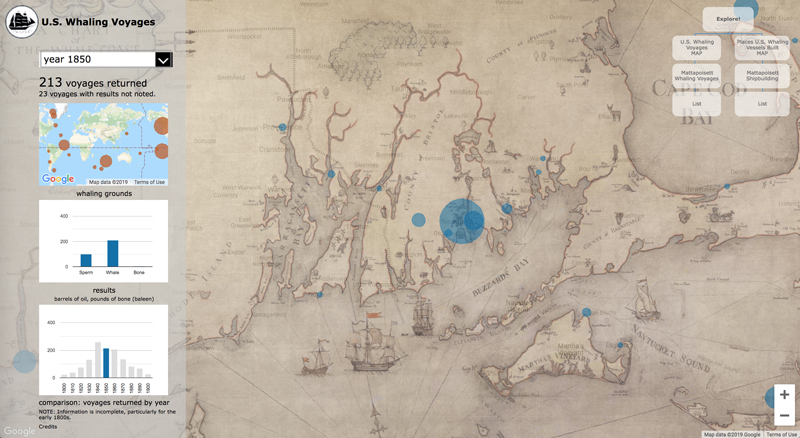 Visualizations summarize the growth of the U.S. whaling and Mattapoisett shipbuilding industries during the 1800s, document changes in occupations, and provide contextualized access to collection images.