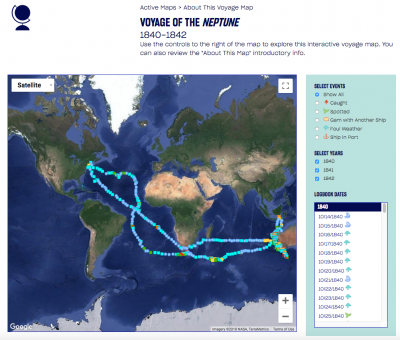 This map represents the journey of the whaler Neptune (Mystic Seaport Museum O-LOG 23) of New London, Connecticut. Chronicling the ship’s voyage from October, 1840 – April, 1842, the map depicts the ship’s day-to-day events as it traveled to the South Atlantic and Indian Oceans as they were described in the ship’s logbook. View the active map →